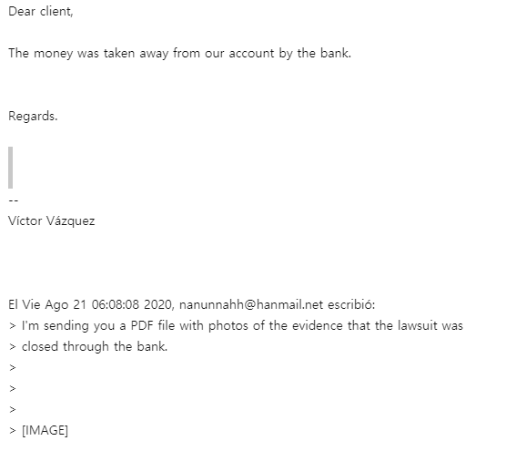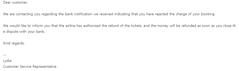 통화가 되니 직원이 은행 얘기를 하면서 '8월 10일에 이미 너에게 메일을 보냈다'라는 것이다. 8월 17일에 처음 통화가 돼서 어버버하다가 끊기고서는 일단 통화가 되었다는 기쁜 마음에 그 다음날도 전화를 했더니 그런 말을 하는 것이다. 메일의 내용은 '연락을 계속 할수록 작업량이 많아지니까 다시 연락하지 않았으면 좋겠어. 은행을 통해서 분쟁 신청한 것을 취소하면 즉시 돌려주겠다'는 내용이었고 그날로 은행 앱을 통해서 환불 신청한 것을 취소했다.